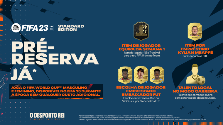 Joga os maiores torneios do futebol com o FIFA World Cup™ masculino e feminino, disponível no FIFA 23 ao longo da época, joga com equipas de clubes femininas – com animações dedicadas recriadas através da tecnologia HyperMotion2 – e desfruta pela primeira vez de funcionalidades de cross-play, que tornam ainda mais fácil jogar contra amigos. Desfruta de uma nova forma de jogar e construir o teu plantel de sonho no FIFA Ultimate Team™ com os Momentos FUT e um sistema de Química redesenhado, ou vive os teus sonhos de futebol no Modo Carreira à medida que defines a tua personalidade enquanto jogador e treinas alguns dos nomes mais famosos do futebol.